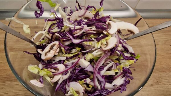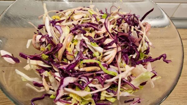 - Öntsd az öntetet a salátára, és keverd jól össze, hogy minden szálat érjen. A káposztasaláta elkészült, tálald azonnal!